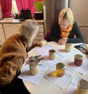 Åtta stycken honungsburkar fick vi in från våra medlemmar till årets honungsbedömning. I lördags den 4 oktober gick testet av stapeln och glädjande nog är samtliga godkända. Vi i honungskommittén tackar för förtroendet och möjligheten att få lukta, smaka och bedöma er fina honung. Nu går samtliga honungsburkar vidare till eleverna på Restaurang- och Livsmedelsprogrammet vid Bruksgymnasiet i Gimo. Efter smaktest utser eleverna två honungsburkar som senare i oktober går vidare till uttagningen av Uppsaladistriktets godaste honung.